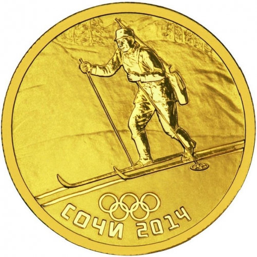 Реверс: на матовом фоне диска – рельефное изображение биатлониста на трассе, представителя вида спорта первых Олимпийских зимних игр, внизу у канта – пять олимпийских колец, под ними надпись: "СОЧИ" и дата: "2014".