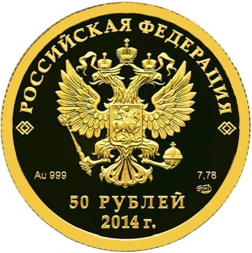 • Аверс: на зеркальном поле диска - рельефное изображение Государственного герба Российской Федерации, над ним вдоль канта – надпись полукругом: "РОССИЙСКАЯ ФЕДЕРАЦИЯ", внизу под гербом: слева – обозначения металла по Периодической системе элементов Д.И. Менделеева и пробы сплава, справа в две строки – обозначение содержания химически чистого металла и товарный знак монетного двора, внизу в центре в две строки – номинал монеты: "50 РУБЛЕЙ" и дата: "2014 г.".