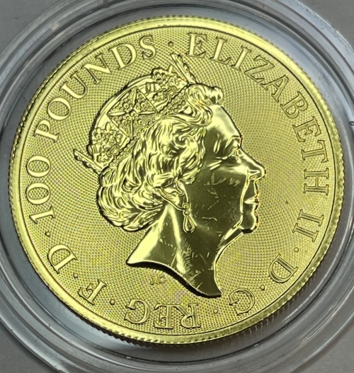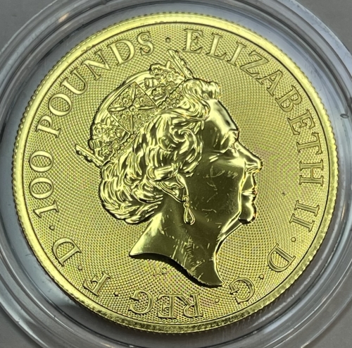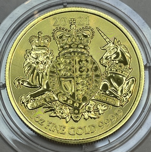 • Золотая монета Королевского монетного двора символизирует силу и величие монархии Соединенного Королевства. Герб работы Тимоти Ноада (Timothy Noad), все детали продуманы и символичны, в нем нет ничего лишнего, только то, что говорит о чести и доблести, о событиях и правящих особах. Королевский герб Великобритании считается персональным для правящего монарха. Все остальные члены монаршей семьи имеют свои геральдические знаки отличия.