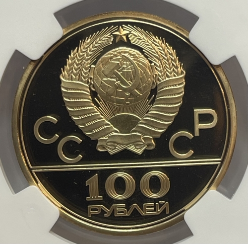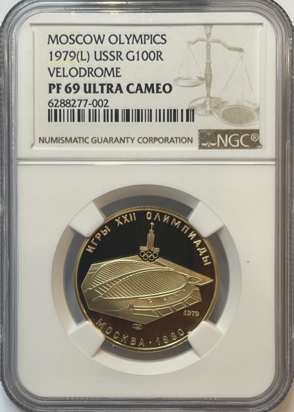 Золотая монета 100 рублей "Велотрек" Олимпиада 80. 1979г. ЛМД в слабе NGC PROOF 69 ULTRA CAMEO
