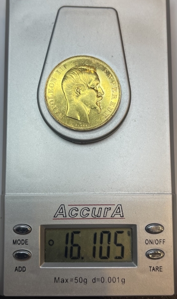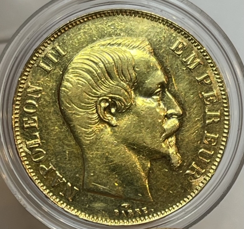 Золотая монета 50 франков Наполеон III 1857 г.,Au 900