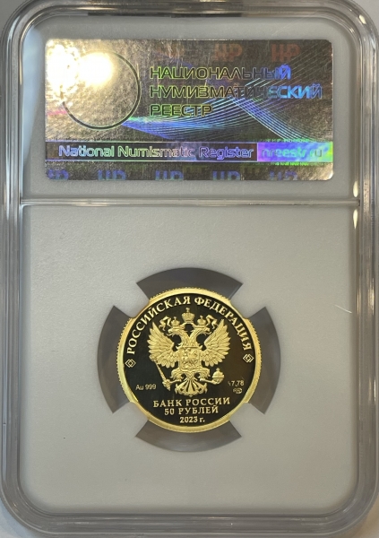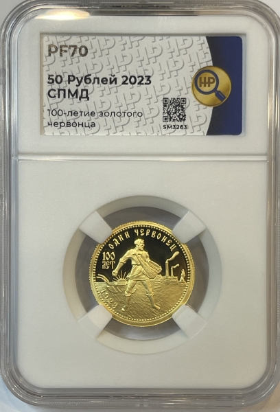 Золотая монета 50 рублей "Червонец Сеятель" СПМД в слабе ННР PROOF 70, 2023 г.
