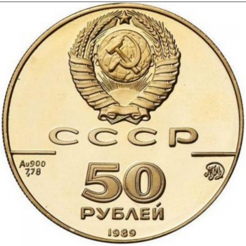 Сверху герб СССР с 15 витками ленты, под ним буквы «СССР», ниже слева и справа черта, под чертой слева химическое обозначение «Au» и проба «900» металла из которого сделана монета, под ними чистый вес драгоценного металла «7,78», под чертой справа монограмма монетного двора «ММД», ниже обозначение достоинства монеты цифра «50» и ниже слово «РУБЛЕЙ», внизу у канта год выпуска монеты «1989».